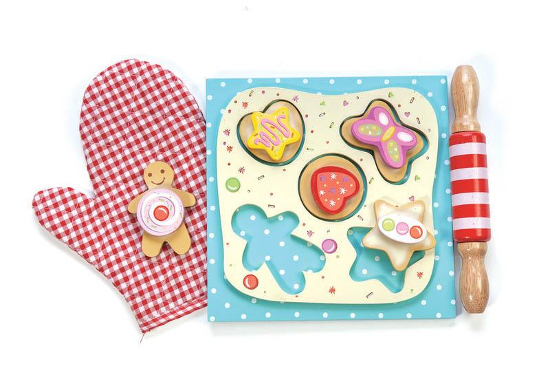 They can prepare the dough with the rolling pin, match the cookies with the baseboard shapes and then pop it in a Le Toy Van wooden oven (not included).
