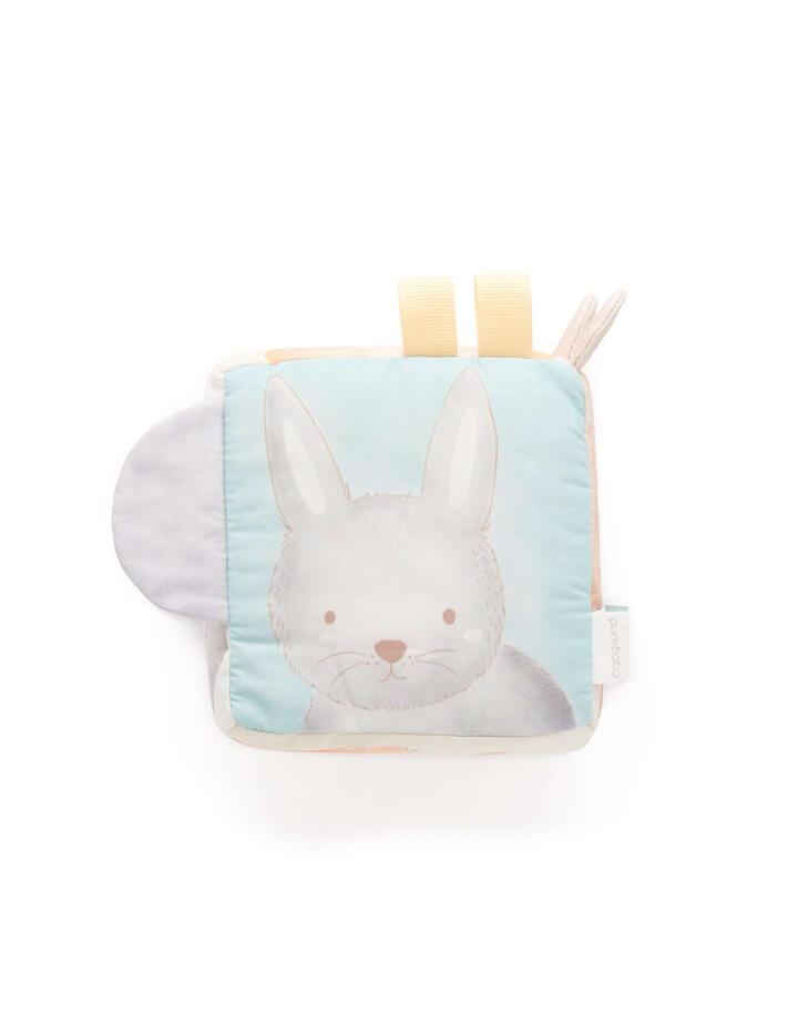 Designed to assist and enhance your little ones development, our Sensory Cube is perfect for play time while developing hand/eye coordination. Featuring sweet animal faces on each side of the cube, as well as ribbon tabs and 3D crinkle ears.