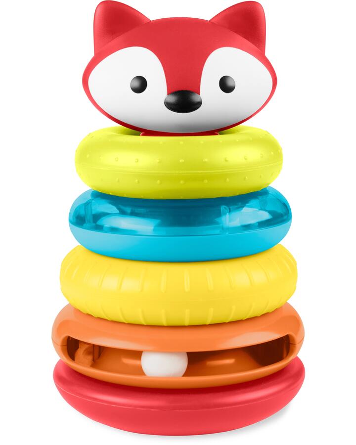 Stack, sort, rattle and roll with our ring stacking toy for baby. Topped with a cute Fox friend and a rocking base, baby will love to grab and stack the four colorful rings. A playful way to encourage fine motor skills, hand-eye coordination and more learn and grow fun.